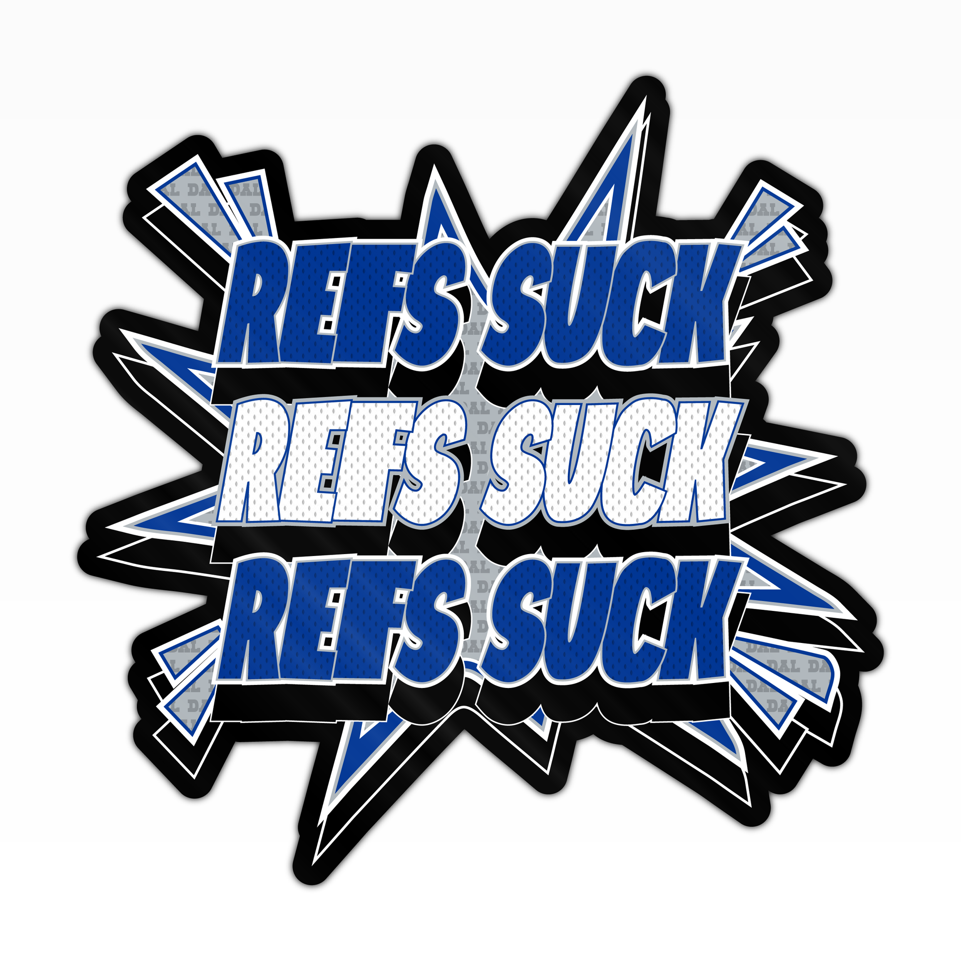 This premium die cut sticker is an explosion of emotion! Three stylized "REFS SUCK" shouts emerge from a city abbreviation-filled boom.